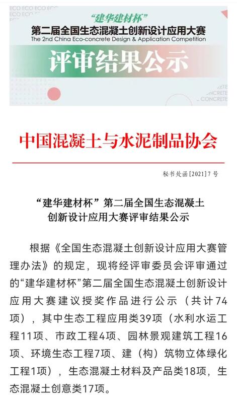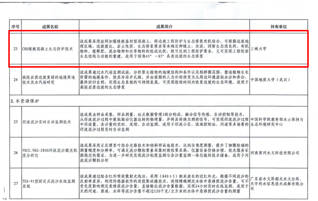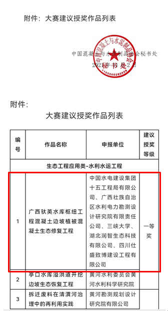 為深入貫徹落實習近平總書記關于保障國家水安全重要講話精神,積極推動新階段水利高質量發(fā)展,切實做好成熟適用水利科技成果推廣運用,切實提高行業(yè)科技水平,水利部組織開展了2021年度成熟適用水利科技成果的征集、評審與公示工作。我公司研發(fā)的核心技術“CBS植被混凝土生態(tài)防護技術”獲得入選,其應用項目“廣西馱英水庫樞紐工程混凝土邊坡植被混凝土生態(tài)修復工程”在2021年度“建華建材杯”第二屆全國生態(tài)混凝土創(chuàng)新設計應用大賽榮獲一等獎。